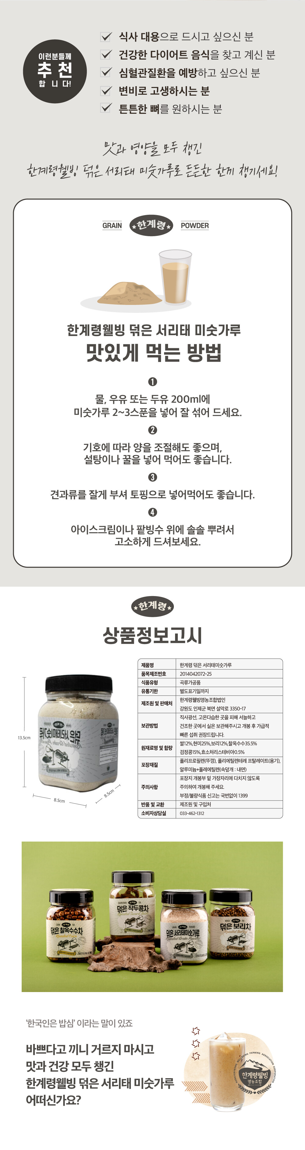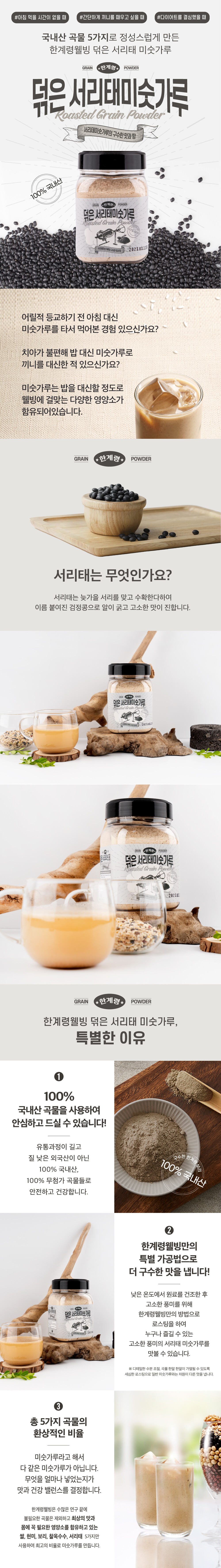 - 국내산 곡물 5가지로 정성들여 만든 서리태미숫가루